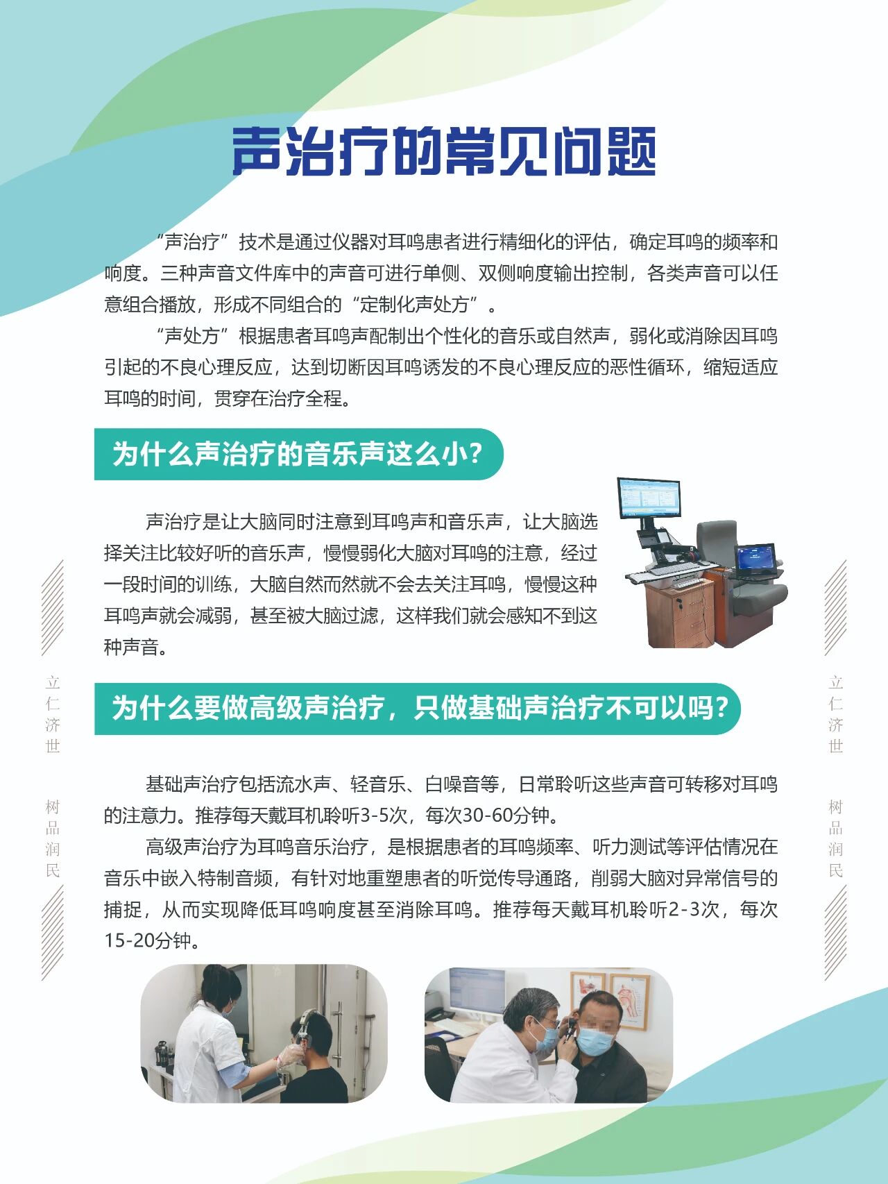 “声治疗”技术是通过仪器对耳鸣患者进行精细化的评估,确定耳鸣的频率和响度。三种声音文件库中的声音可进行单侧、双侧响度输出控制,各类声音可以任意组合播放,形成不同组合的“定制化声处方”。