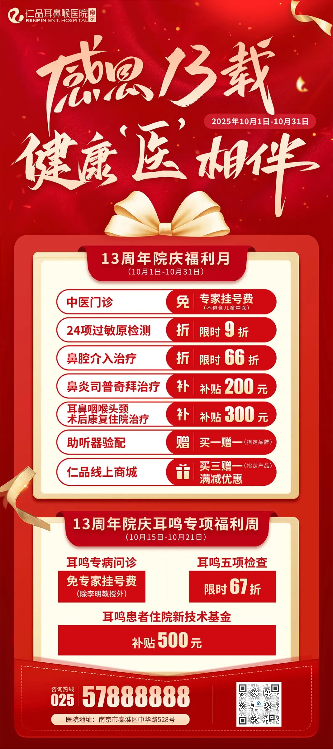 金秋十月,感恩同行!2025年10月18日,南京仁品耳鼻喉专科医院将迎来建院13周年的重要时刻。为了...