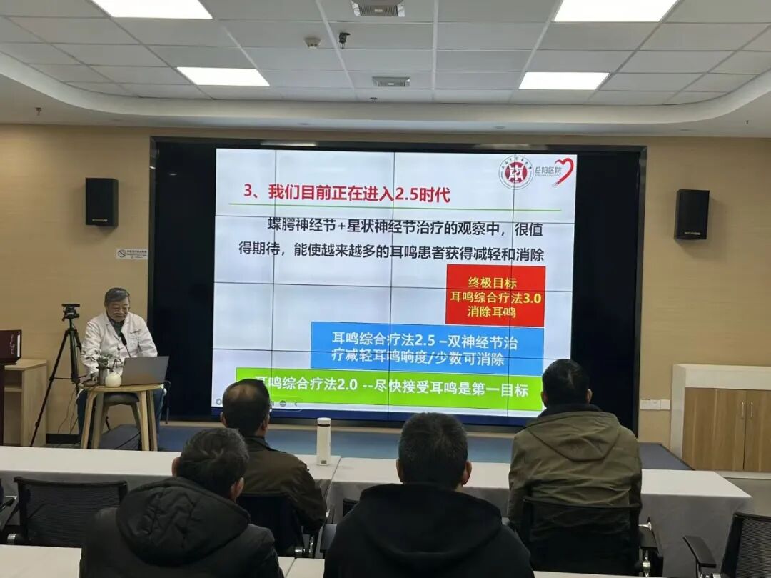 交流解惑、声治疗、对症疗法、双神经节治疗组成,以适应耳鸣为第一目标,具有“系统、规范、精准、易操作、可重复”等优点。该疗法以“身心同治”为准则,为每一位耳鸣患者建立健康档案,提供全流程评估、准确诊断、特色针对治疗、中西医结合治疗、蝶腭神经节针刺+星状神经节阻滞治疗、心理疏导、生活管理等全病程慢病管理服务。